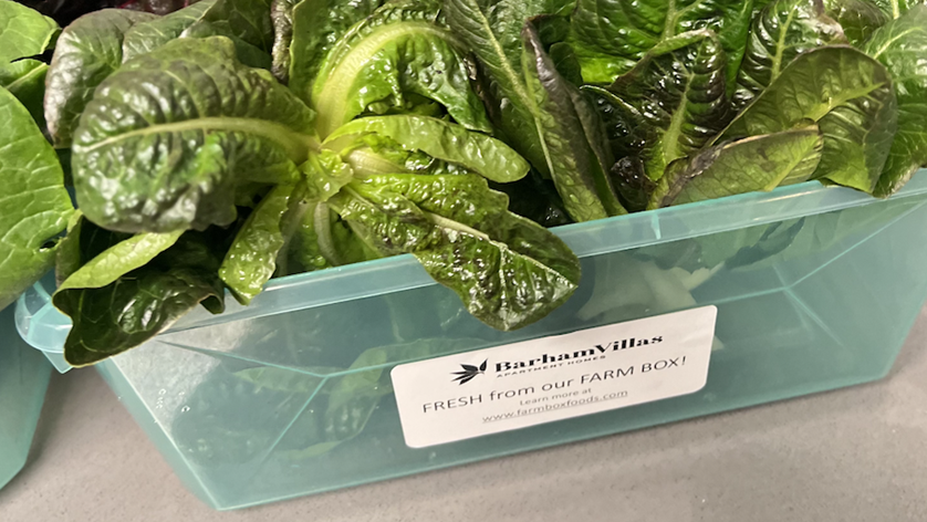 Did you know Barham Villas has its own vertical hydroponic farm? From the outside, it looks like a shipping container, but the inside is home to an abundance of high-quality produce all in 320 square feet of space. Our FarmBox program went live earlier this year and is designed for high-yield with a low carbon footprint, allowing us to offer our residents access to free, healthy food options several times per year.